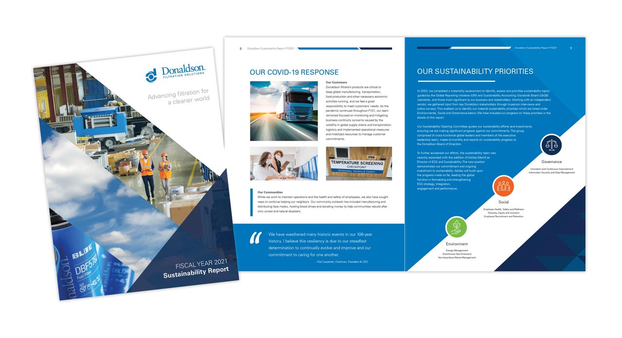 Number three is where I come in. See an example of my work in the sustainability report I recently completed for the century-old filtration industry leader, Donaldson Company here.