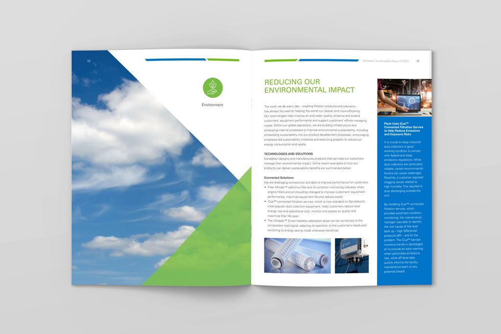 Client: Donaldson Company | Industry: Manufacturing | Project Scope: Donaldson Company is a global air filter manufacturer for industrial, aerospace, chemical, alternative energy and pharmaceutical sectors. We worked closely with the Communications Department to create a sustainability report that highlights key statistics and ESG goals with engaging design elements and visuals.
