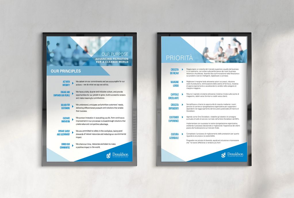 Another collaboration with Donaldson to create in-house signage to showcase the company's core values and priorities for their corporate headquarters and all locations internationally.